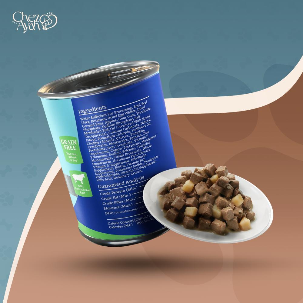 - Primary Ingredients: Water Sufficient for Processing, Beef, Beef Liver, Potatoes, Dried Egg Whites, Dried Ground Peas, Apples