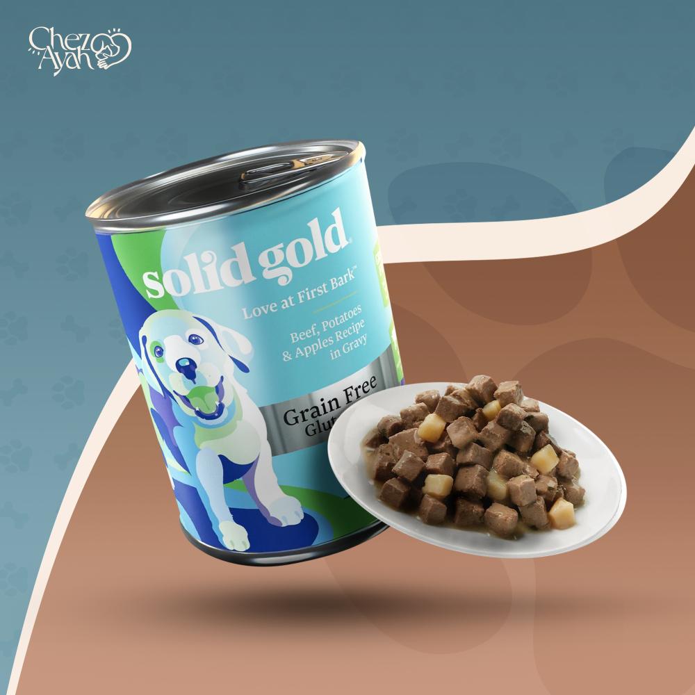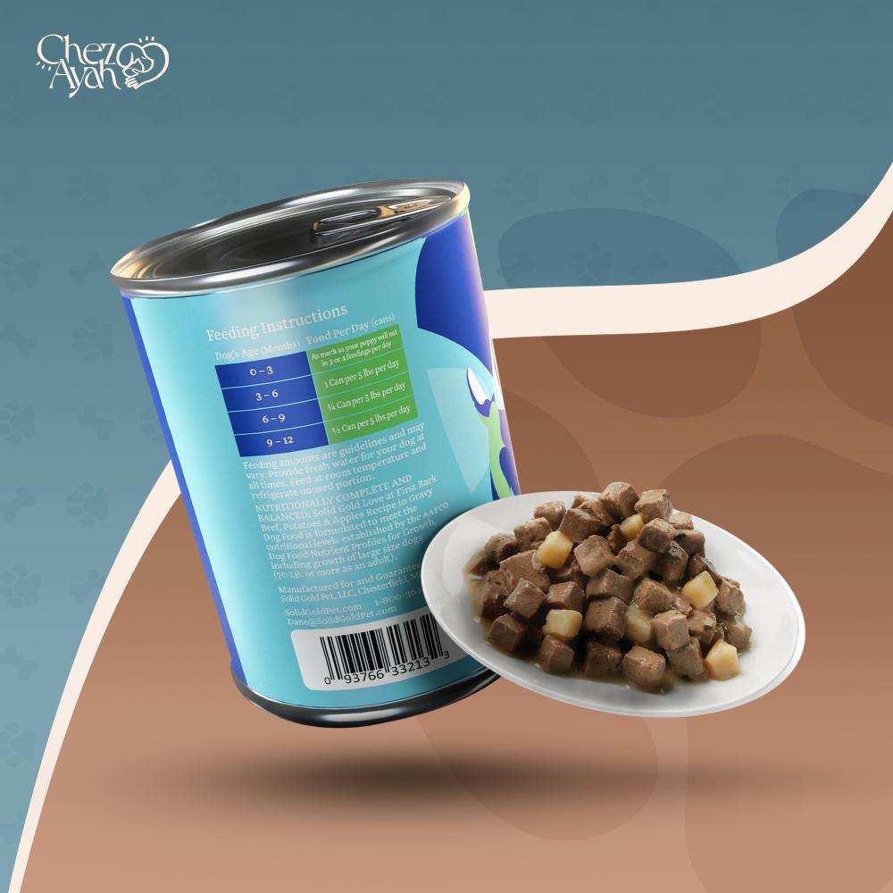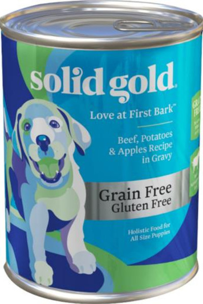 Solid Gold Love At First Bark Beef, Potatoes & Apples Puppy Recipe Grain-Free Canned Dog Food is specially formulated for growing puppies. This highly-digestible formula features high-protein beef and beef liver, combined with wholesome potatoes and apples in a delicious gravy. It is designed to support your puppy’s immune system, bone growth, and overall well-being with a unique blend of superfoods and essential nutrients.
